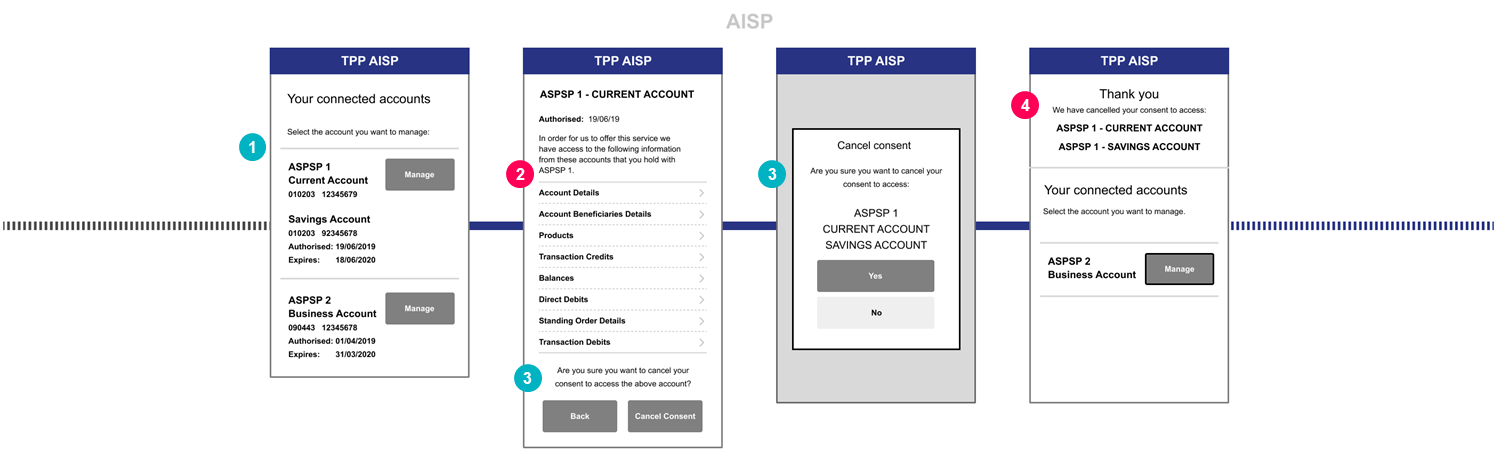 This content is best viewed on a desktop browser. 1 CX Considerations 1AISP should offer functionality ( e.g. search, sort, filter) to enable a PSU to search for the relevant consent. This will be of particular benefit as the number of consents for different ASPSPs/ accounts given by a PSU to TPPs increases. 2 CEG Checklist Requirements 2AISPs must describe the data being shared through each consent using the structure and language recommended by OBIE following customer research (see Data Cluster Structure & Language below) and ensure this request is specific to only the information required for the provision of their account information service to the PSU. AISPs should present the data at a Data Cluster level and allow the PSU to expand the level of detail to show each Data Permission. The Consent Dashboard should also describe: The purpose of the data request (including whether any other parties will have access to the information). Where the request is for multiple product types, the detail should explain to the customer the product type to which it applies or state that it is shared across multiple product types. If relevant, the length of time for which this consent is valid (e.g. one off use, for a set period of time e.g. one year, or with no end date) The period for which the transaction data has been requested (e.g. transactions for the last 12 months). When the TPP’s access to the data will expire. The date the consent was granted. If the customer-facing entity is acting on behalf of an AISP as its agent, the PSU must be made aware that the agent is acting on behalf of the AISP. The consent dashboard must allow a PSU to view or cancel the access they have given consent to. The functions “cancel assess” and “back” should be displayed with equal prominence to the PSU. “Agent” means a person or entity who acts on behalf of an authorised payment institution or a small payment institution in the provision of payment services including account information services. 3 CX Considerations 3The AISP should make the exact consequences of cancelling the consent clear to the PSU – i.e. they will no longer be able to provide the specific service to the PSU 4 CX Considerations 3The AISP should make the exact consequences of cancelling the consent clear to the PSU – i.e. they will no longer be able to provide the specific service to the PSU 5 CEG Checklist Requirements 4AISPs must inform the ASPSP that the PSU has withdrawn consent by making a call to DELETE the account-access-consent resource as soon as practically possible (as described in Version 3 of the API specifications). This will ensure that no further account information is shared. ASPSPs must support the Delete process as described in the Version 3 API specifications. (This is not visible to the PSU but will ensure no further account information is provided by the ASPSP to the AISP). Select to scroll left Select to scroll right