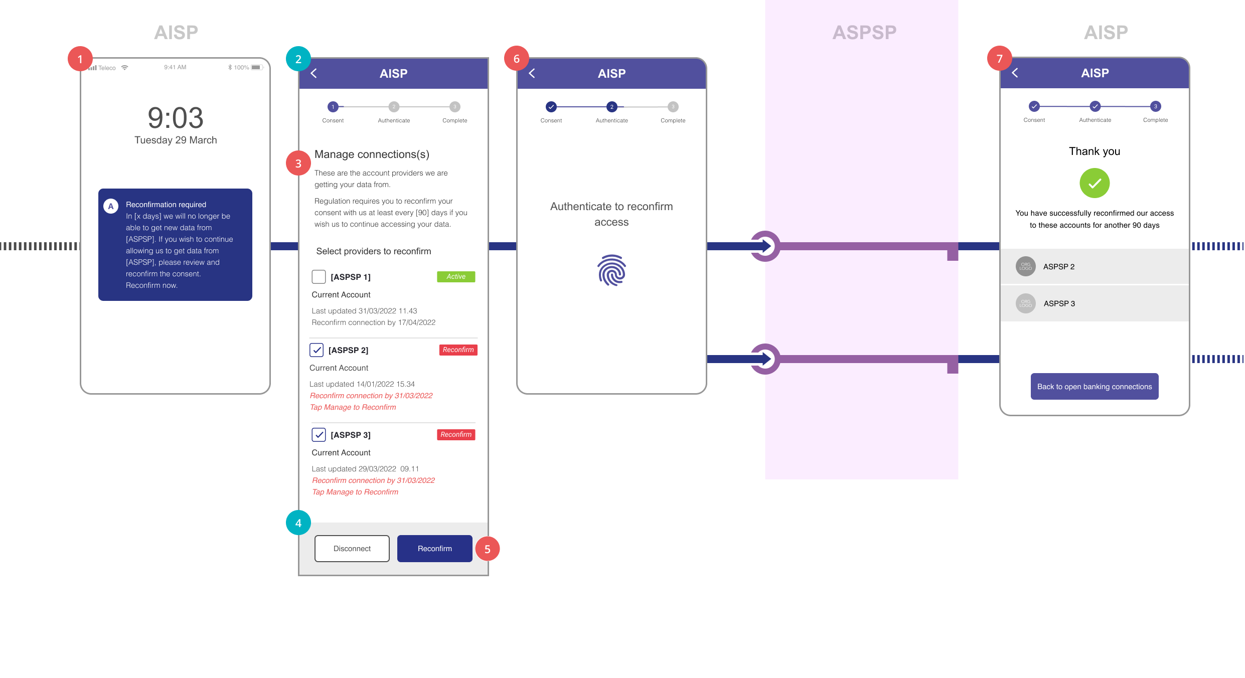 This content is best viewed on a desktop browser. 1 CEG Checklist 1AISPs must alert the PSU when authentication needs to be performed to refresh AISP access. Note: AISP may notify the PSU (in session or outside e.g via SMS or push notification) in advance and the advance period can be left in the AISPs competitive space. 2 CX Considerations 2AISPs should allow the PSU to select all the payment accounts across ASPSPs that may or may not be due for access refresh. 3 CX Checklist 3AISPs should make it clear that the PSU is being asked to authenticate to extend the AISP access to their account data and that no other element of the consent (e.g. the data permissions required, the purpose for which it will be used etc.) will change. If the customer-facing entity is acting on behalf of an AISP as its agent, the PSU must be made aware that the agent is acting on behalf of the AISP. 4 CEG Considerations 4AISPs must also allow the PSU to confirm their request after selecting the accounts. 5 CEG Checklist 5AISPs must also allow the PSU to confirm their request after selecting the accounts. 6 CEG Checklist 6AISPs must ask the PSU to undergo SCA with the AISP provided credentials as agreed with the ASPSPs. 7 CEG Checklist 7AISPs must provide confirmation to the PSU that authentication has been successfully completed and access has been refreshed. Note: AISP may do an a-synchronised call to each ASPSP after the PSU has confirmed their request and successfully authenticated to continue access. The AISP should notify the PSU with an appropriate message that access to the respective account(s) will be refreshed with their ASPSP(s). Select to scroll left Select to scroll right