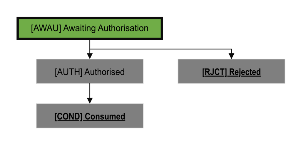 • A ‘GET’ status call by the PISP at this stage should also respond with status ‘AWAU’. If the staging is unsuccessful the PISP must rely on the reason code(s) provided by the ASPSP in the error message.