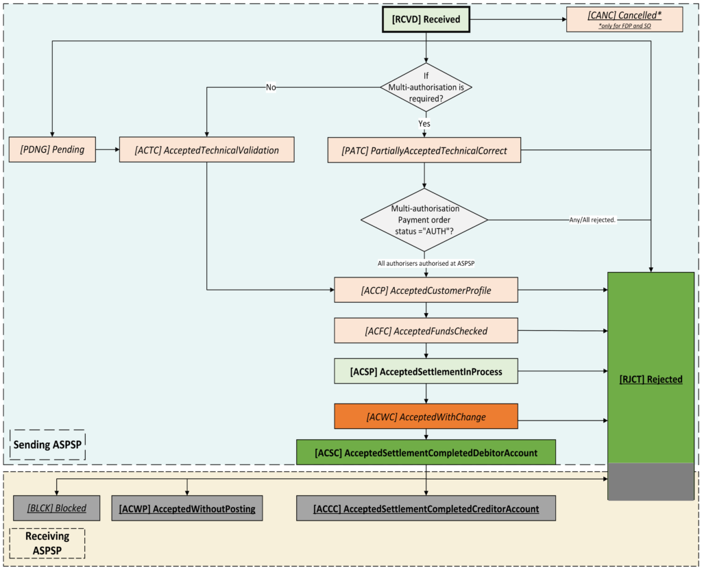 • ASPSP should use the additional status ‘ACTC’ which means ‘Accepted Technical Validation’ to indicate that technical validations on the payment order resource have been successfully completed.
