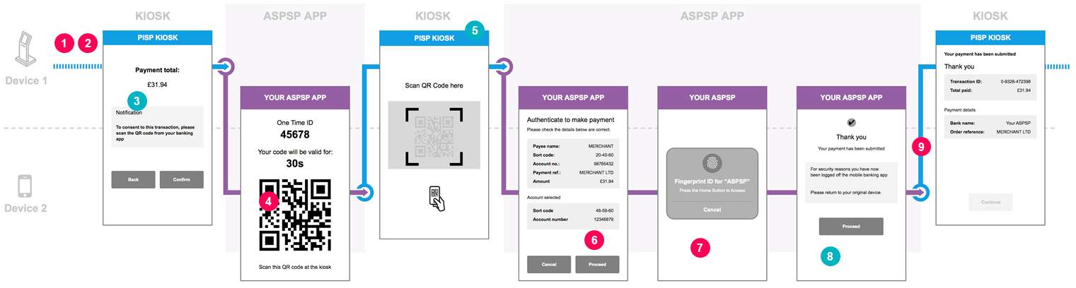 This content is best viewed on a desktop browser. 1 CEG Checklist Requirements 1Not shown in the diagram but as in 1 & 2 in Model A. 2 CEG Checklist Requirements 2Not shown in the diagram but as in 1 & 2 in Model A. 3 CX Considerations 3If PISPs and ASPSPs support Model B then the PISP should provide the PSU information on how the identifier can be generated with their ASPSP and make the PSU aware about how this identifier will be used. 4 CEG Checklist Requirements 4PSUs use the ASPSP app to generate the unique identifier. 5 CX Considerations 5PSUs should be able to easily provide the identifier to the PISP application (e.g. scan the code into the Kiosk in this instance). 6 CEG Checklist Requirements 6After the PSU provides the ASPSP app generated identifier to the PISP, then the ASPSP must display the payment request within the same session of the ASPSP app and clearly mention the amount and the payee. 7 CEG Checklist Requirements 7ASPSPs must apply SCA which should have no more than the number of steps that the PSU would experience when directly accessing the ASPSP mobile app (biometric, passcode, credentials). 8 CX Considerations 8ASPSPs must make the PSU aware that they have been logged off from the ASPSP app and notify them to check back on the originating PISP app. 9 CEG Checklist Requirements 9The PISP must confirm successful confirmation of payment initiation. Select to scroll left Select to scroll right