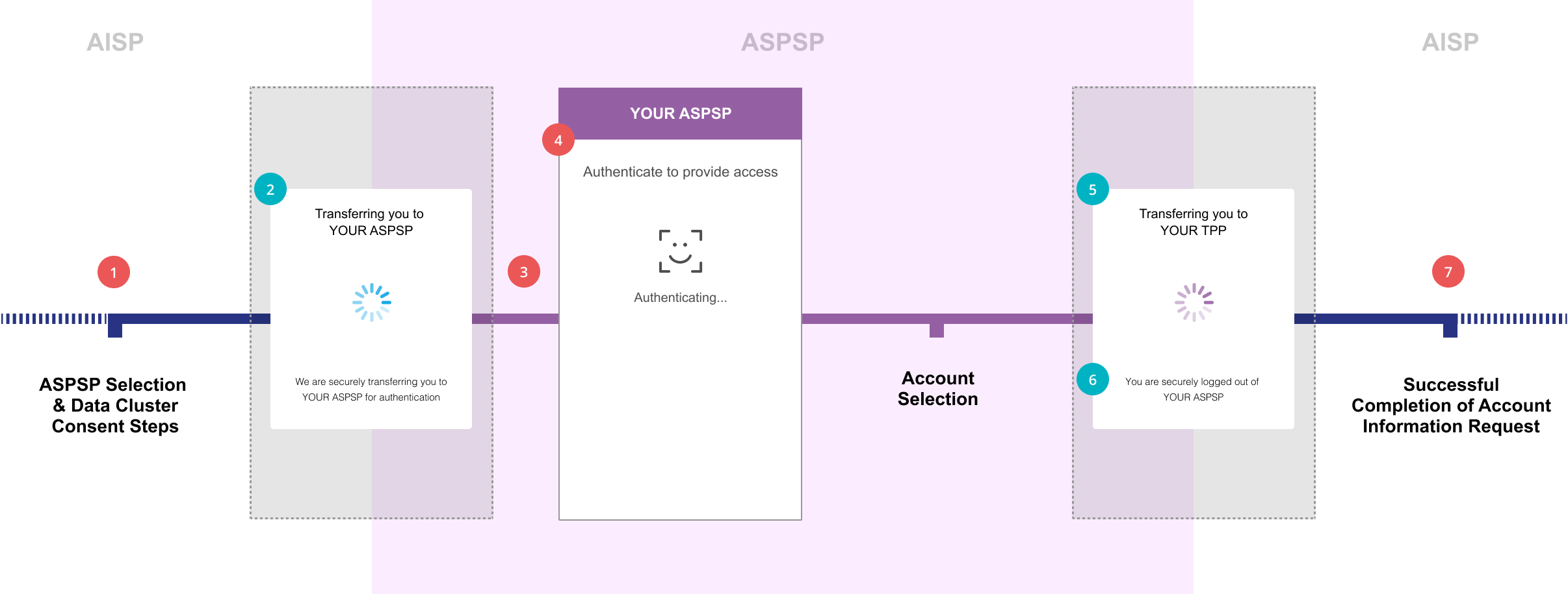This content is best viewed on a desktop browser. 1 CEG Checklist Requirements 1AISPs must initially ask PSU to identify ASPSP so that the consent request can be constructed in line with the ASPSP’s data cluster capabilities. 2 CX Considerations 2AISPs should make the PSU aware on the inbound redirection screen that they will be taken to their ASPSP for authentication for account access. 3 CEG Checklist Requirements 3If the PSU has an ASPSP app installed on the same device the redirection must invoke the ASPSP app for authentication purposes only without introducing any additional screens. The ASPSP app based authentication must have no more than the number of steps that the PSU would experience when directly accessing the ASPSP mobile app(biometric, passcode, credentials) and offer the same authentication method(s) available to the PSU when authenticating in their ASPSP’s direct channels. 4 CEG Checklist Requirements 4After authentication the PSU must be deep linked within the app to confirm the account(s) which they would like the AISP to have access to without having to go through any further mandatory screens. For details on deep linking see Appendix 7.3. 5 CX Considerations 5ASPSPs should have an outbound redirection screen which indicates the status of the request and informing the PSU that they will be automatically taken back to the AISP. 6 CX Considerations 6ASPSPs should inform the PSU on the outbound redirection screen that their session with the ASPSP is closed. 7 CEG Checklist Requirements 7AISPs should confirm the successful completion of the account information request. Select to scroll left Select to scroll right