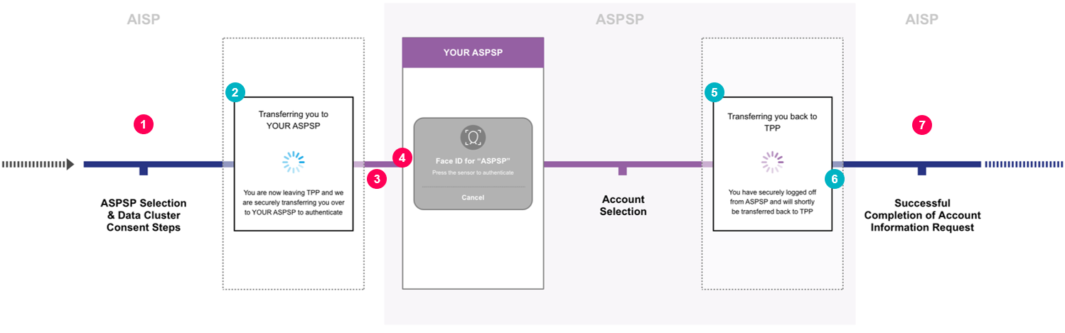After authentication the PSU must be deep linked within the app to confirm the account(s) which they would like the AISP to have access to without having to go through any further mandatory screens. For details on deep linking see Appendix 7.3.