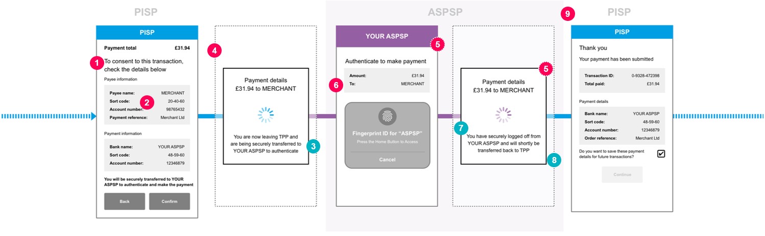 ASPSPs must display as minimum the Payment Amount, Currency and the Payee Account Name on to make the PSU aware of these details (unless an SCA exemption is being applied). These details must be displayed as part of the authentication journey on at least one of the following screens without introducing additional confirmation screens (unless supplementary information is required, refer to section 4.1.2): 1. Authentication screen; 2. ASPSP to PISP outbound redirection screen.