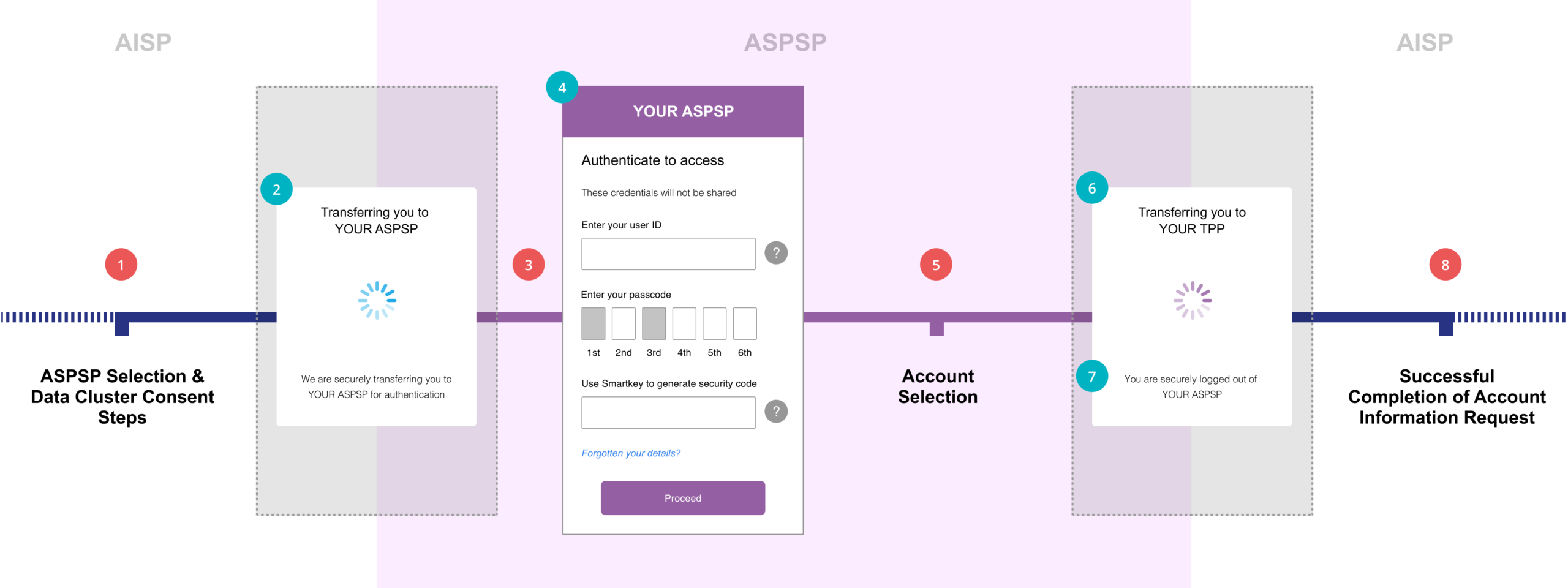 This content is best viewed on a desktop browser. 1 CEG Checklist Requirements 1AISPs must initially ask the PSU to identify the ASPSP so that the consent request can be constructed in line with the ASPSP’s data clusters. 2 CX Considerations 2AISP should make the PSU aware on the inbound redirection screen that they will be taken to their ASPSP for authentication for account access. 3 CEG Checklist Requirements 3The redirection must take the PSU to the ASPSP web page (desktop/mobile) for authentication purposes only without introducing any additional screens. The web based authentication must have no more than the number of steps that the PSU would experience when directly accessing the web based ASPSP channel (desktop/mobile). 4 CX Considerations 4ASPSP should make the PSU aware that the PSU login details will not be visible to the AISP. 5 CEG Checklist Requirements 5PSUs must be able to confirm the account(s) which they would like the AISP to have access to without having to go through any further unnecessary screens. 6 CX Considerations 6SPSP should have an outbound redirection screen which indicates the status of the request and informs the PSU that they will be automatically taken back to the AISP. 7 CX Considerations 7ASPSP should inform the PSU on the outbound redirection screen that their session with the ASPSP is closed. 8 CEG Checklist Requirements 8AISPs should confirm the successful completion of an account information data request. Select to scroll left Select to scroll right