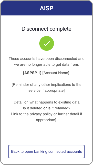 This is in addition to the confirmation screen during the authentication journey, and so the timing could be a day or so after, or the next time the PSU logs into their direct online channels. This also provides a security benefit if a PSU doesn’t recognise the connection. This could be done in a variety of ways, for example during login or on a home page feed, or through a durable medium such as SMS, email or private bank message.
