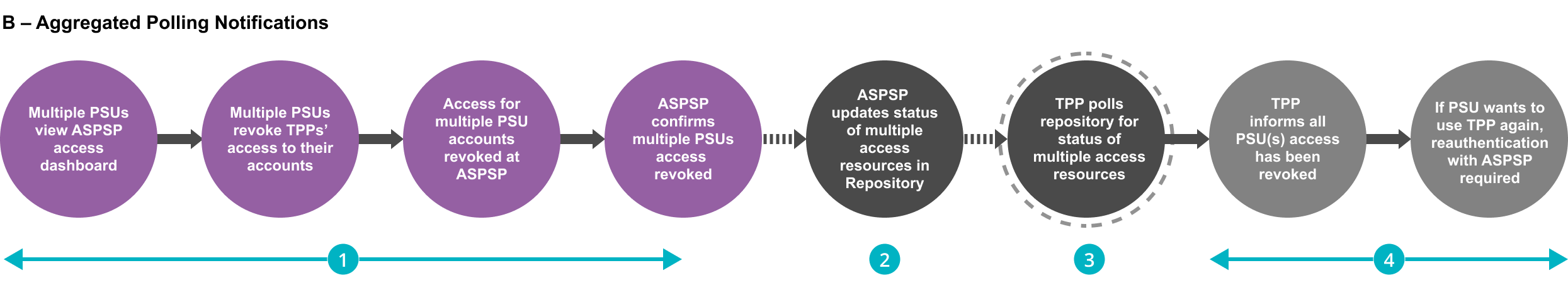 • Similar to basic polling, aggregated Polling is about the provision of notification of revocations from ASPSPs to TPPs, upon TPP request, enabling TPPs to update their records and contact the PSUs, if required, at the point in time of the request. However, the key difference is that rather than focusing on a specific access resource’s status (via a GET request on that specific resource), aggregated polling allows a TPP to poll for the outstanding or awaiting events in the ASPSP’s events repository related to multiple access consents from multiple PSUs.