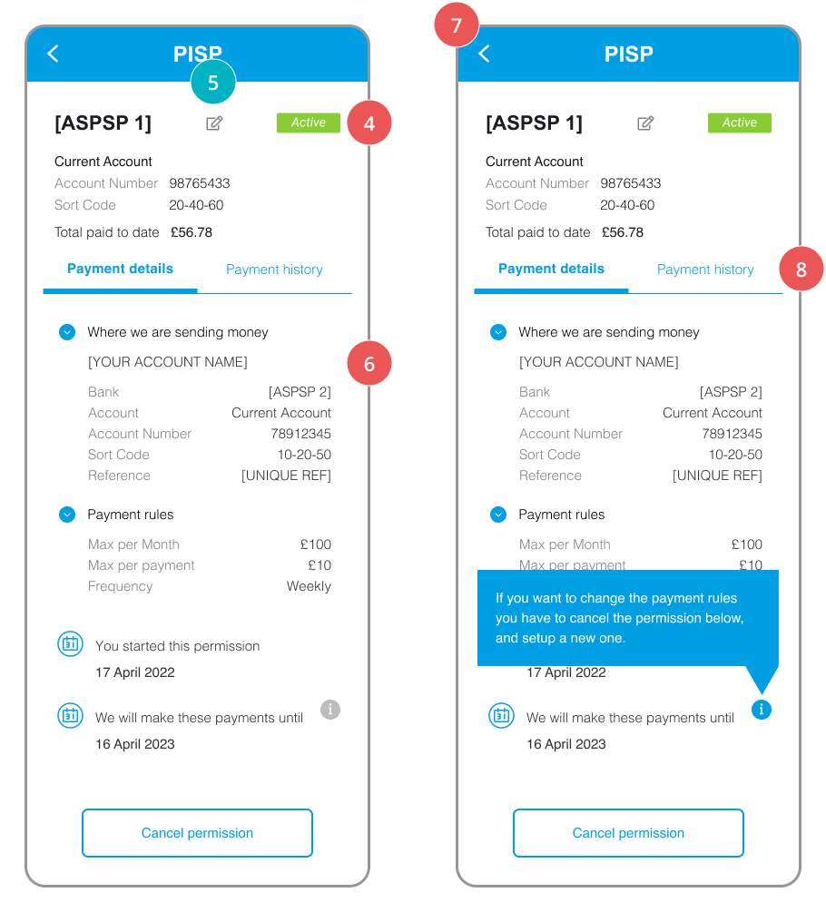 PISPs should provide additional explanatory text to help PSUs understand how to cancel long-lived consent and an overview of the payment details. Using information bubbles helps to keep information manageable. In the example provided we use the language “payment details” but PISPs can decide how best to explain this point.