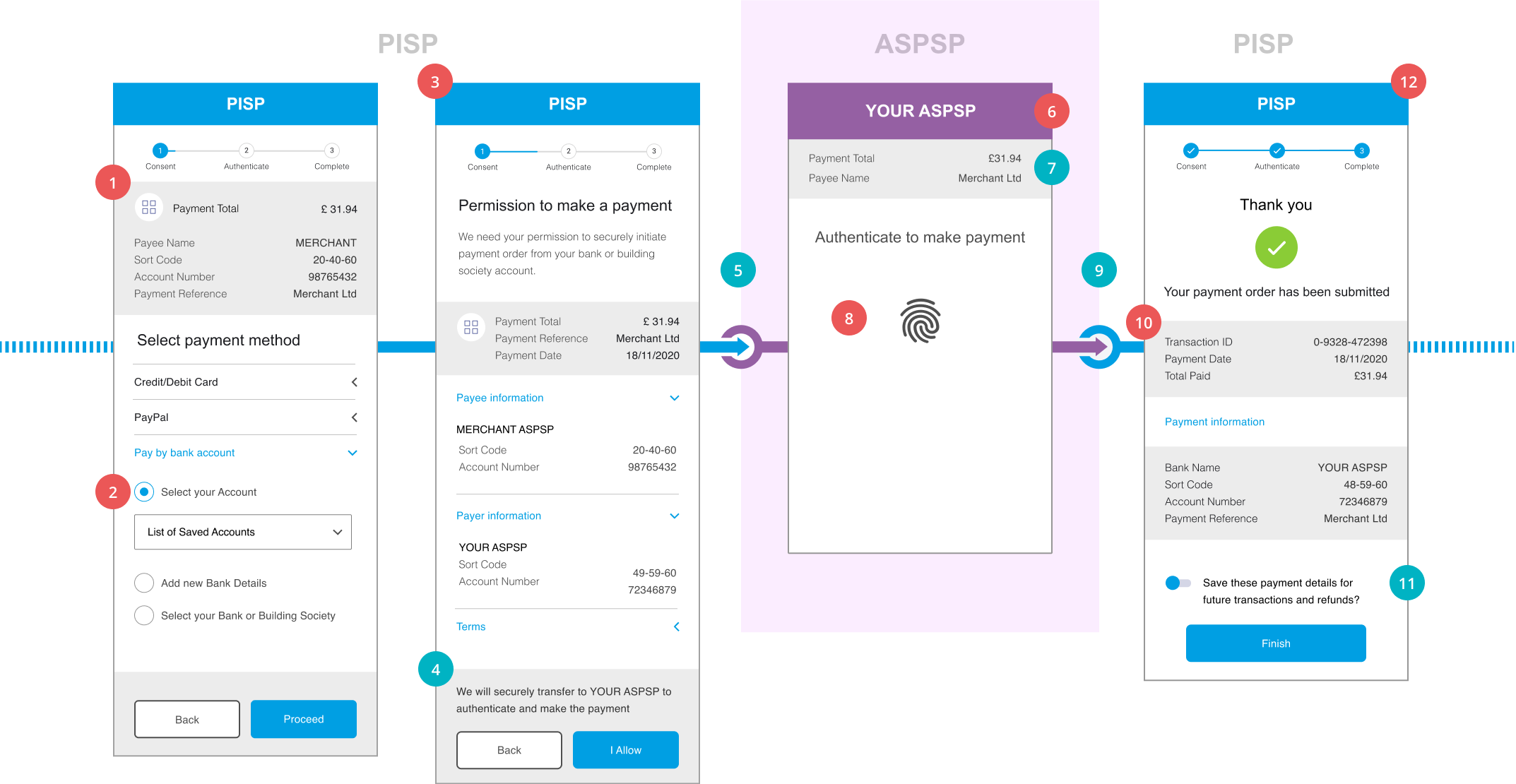 This content is best viewed on a desktop browser. 1 CEG Checklist Requirements 1Minimum Set of Parameters PISPs must either allow PSUs to specify the below minimum set of parameters or pre-populate them for the PSUs: Payment Amount and Currency (GBP for UK implementations). Payee Account Name. Payee Account Identification details (e.g. account number and sort code or additionally roll number or full IBAN). Payment Reference – This is optional but it is good practice to be populated for a payment. Any supplementary information required which the ASPSP has published as required and is specific to that ASPSP. 2 CEG Checklist Requirements 2PSU payment Account Selection PISPs must provide PSUs at least one of the following options: Enter their Payer’s payment Account Identification details. PISPs must allow PSUs to enter their payment Account Identification details in at least one of the ways specified in the Open Banking V3 Read/Write API Specifications (e.g. account number and sort code – with additional roll number if required, IBAN, PAN, Paym and other formats). Select their Account Identification details (this assumes they have been saved previously). Select their ASPSP in order to select their PSU payment Account from there later on in the journey. Note 1: In some of the above cases, PISPs may also need PSUs to provide their ASPSP name so that PISPs can check whether ASPSPs will be able to match the account identifier to the underlying PSU payment account. Note 2: The use of IBAN as an identification of the payer account for UK ASPSPs is not expected to be heavily used as account and sort code are the main account identifiers used in the UK. IBAN however will be used by non UK ASPSPs implementing OBL standards and offering their services in the UK. 3 CEG Checklist Requirements 3PSU Consent to PISP PISPs must request for the PSUs’ consent to the payment in a clear and specific manner. PISPs must display the following information in the consent screen: •Payment Amount and Currency (GBP for UK implementations). •Payee Account Name. •Payment Reference, and any supplementary info, if it has been entered by PSUs or pre-populated by PISPs in item #1. •PSU payment Account Identification and/or the selected ASPSP (based on item #2 options). •Note: if PSU payment Account identification is provided by PSUs in item #2, PISPs could use this to identify and display the ASPSP without having to ask PSUs. For Payee Account Identification details (e.g. account number and sort code or additionally roll number or full IBAN): •If this has been provided by PSUs in item #1, then PISPs must also display this in the consent screen to allow PSUs to check and verify correctness. •If this has been pre-populated by PISPs (e.g. in a eCommerce payment scenario) PISPs could choose whether to display this information or not. 4 CX Considerations 4PISPs should provide messaging to inform PSUs that they will be taken to their ASPSPs to complete the payment. Example wording: %22We will securely transfer to YOUR ASPSP to authenticate and make the payment“. 5 CX Considerations 5Generic PISP to ASPSP redirection screen and message. Please refer to Sections Browser based redirection – PIS, App based redirection – PIS and Effective use of redirection screens. 6 CEG Checklist Requirements 6ASPSPs must display as minimum the Payment Amount, Currency and the Payee Account Name to make the PSU aware of these details (unless an SCA exemption is being applied). These details must be displayed as part of the authentication journey on at least one of the following screens without introducing additional confirmation screens (unless supplementary information is required, refer to section Single Domestic Payments – Supplementary info. ASPSPs’ Authentication screen (recommended). ASPSP to PISP redirection screen These details must be displayed as part of the authentication journey on at least one of the following screens without introducing additional confirmation screens (unless supplementary information is required, refer to section 4.1.2) 7 CX Considerations 7ASPSPs should inform PSUs about their “point of no return” for making the payment and that their payment will be made after authentication occurs. Example wording: %22Authenticate to make payment”. For recognition based biometrics (e.g. Face ID) which can be more immediate the biometric authentication should be invoked after a delay or through a call to action to allow the PSU the ability to view the details. ASPSPs could display the balance of PSUs payment account (not shown on user journey) as part of the authentication journey on any of the following screens: 1. ASPSPs’ Authentication screen. 2. ASPSP to PISP redirection screen. Displaying the balance in this instance need not require any additional strong customer authentication. 8 CEG Checklist Requirements 8SCA Authentication (including dynamic linking) must be the only action required at the ASPSPs (unless supplementary information required, refer to section Single Domestic Payments – Supplementary info). The ASPSP authentication must have no more than the number of steps that the PSU would experience when directly accessing the ASPSP channel. 9 CX Considerations 9Generic ASPSP to PISP redirection screen and message. Please refer to Section Effective use of redirection screens. 10 CEG Checklist Requirements 10PISP Confirmation PISPs must display the information received from the ASPSP. This information may include: The unique identifier assigned to the payment instruction by ASPSPs. The payment status (and status update date & time) – Confirmation of successful payment initiation. If received by ASPSPs, PISPs must display any of the following information regarding initiation and execution of the payment: The expected payment execution date & time. The expected settlement date & time (i.e. the value date of the payment). The ASPSP charges (where applicable). 11 CX Considerations 11I