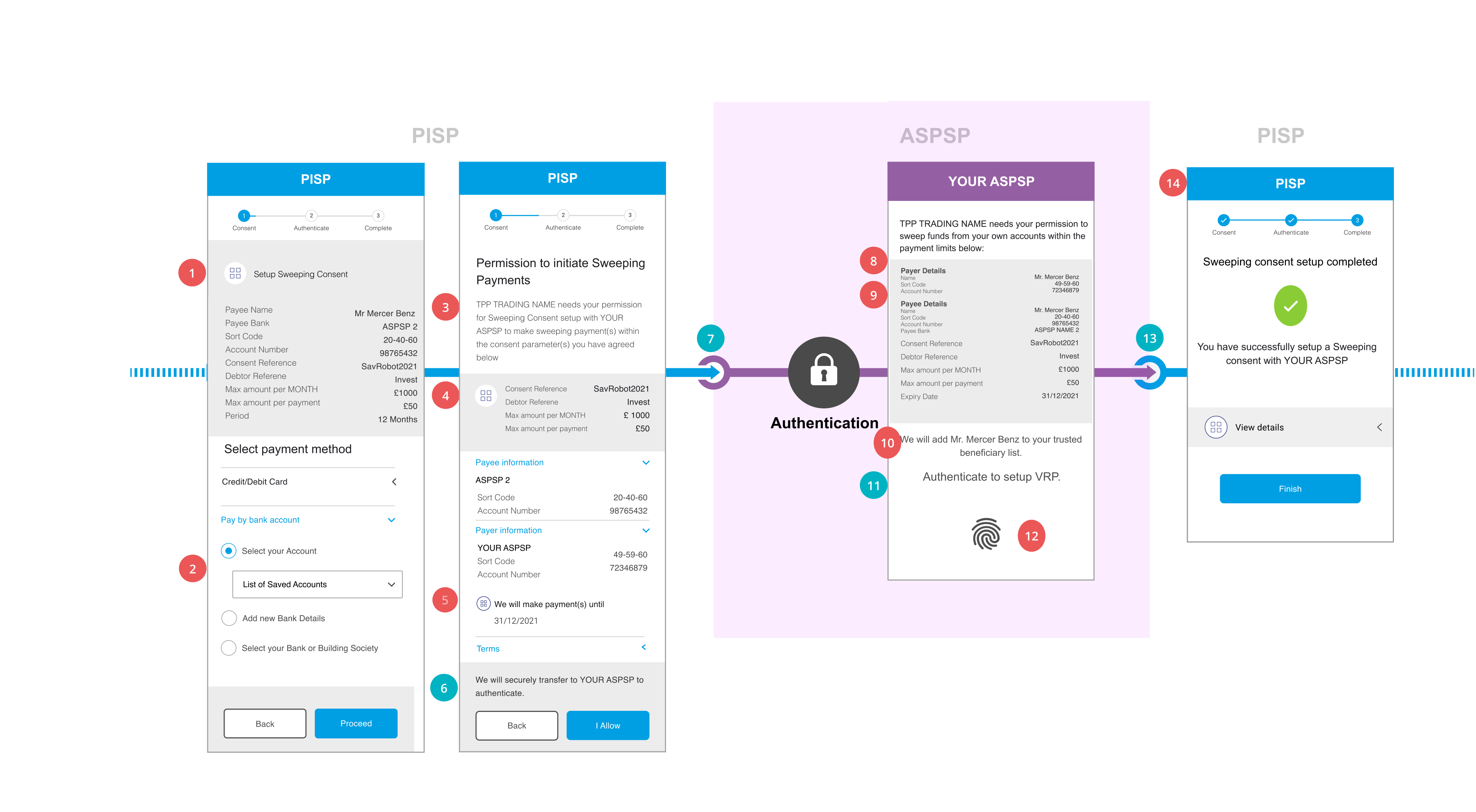 This content is best viewed on a desktop browser. 1 CEG Checklist Requirements 1PISPs must either allow PSUs to specify consent parameters or pre-populate them for the PSUs enabling the PSU to amend any of them as required. The PSU can be treated as having given explicit consent, suitable for the ASPSP to apply a trusted beneficiary exemption to the sweeping payments, provided that the consent includes the required consent parameters listed below: Required set of Sweeping Consent Parameters Payee Account Name. Payee Account Identification details (e.g. account number and sort code or additionally roll number or full IBAN). Maximum amount per payment and Currency (GBP for UK implementations). Maximum amount per frequency (Day/Week/Fortnight/Month/HalfYear/Year) and Currency (GBP for UK implementations). Expiry Date (Ongoing or a Specific Date). Consent Reference. 2 CEG Checklist Requirements 2PSU payment Account Selection PISPs must provide PSUs at least one of the following options: • Enter their Payer’s payment Account Identification details. •PISPs must allow PSUs to enter their payment Account Identification details in at least one of the ways specified in the OBIE V3 Read/Write API Specifications (e.g. account number and sort code – with additional roll number if required, IBAN, PAN, Paym and other formats). • Select their Account Identification details (this assumes they have been saved previously). • Select their ASPSP in order to select their PSU payment Account from there later on in the journey. Note1: In some of the above cases, PISPs may also need PSUs to provide their ASPSP name so that PISPs can check whether ASPSPs will be able to match the account identifier to the underlying PSU payment account. Note 2: The use of IBAN as an identification of the payer account for UK ASPSPs is not expected to be heavily used as account and sortcode are the main account identifiers used in the UK. IBAN however will be used by non UK ASPSPs implementing OBIE standards and offering their services in the UK. 3 CEG Checklist Requirements 3Use of clear language to the PSU that they will be consenting to give the PISP the ability to make payment on a (sporadically or periodically) recurring basis. PISPs must display the company’s trading name/brand name (i.e. the Client Name) to the PSU during the setup and revocation of consent. If the PISP is only trading with its registered company name then it must display that name to the PSU. If the PISP is not the customer-facing entity and there is an Agent who is acting on behalf of the PISP, then the Agent must make the PSU aware that they are acting as an agent on behalf of the PISP and must also, display the PISP’s full trading name/brand name or registered company name whichever is the customer-facing brand of the PISP. PISPs must also, populate the Agent company name in the ‘On behalf of’ field of the software statement, in order to inform the ASPSP about the agency relationship and allow the ASPSP to be able to display this information to the PSU (please refer to item #5). Only in instances where there is an Agent acting on behalf of the PISP, the ‘On Behalf of’ name must be displayed to the PSU. PISPs must not populate the ‘ On behalf of’ field with the details of their TSP. 4 CEG Checklist Requirements 4PSU Consent to PISP PISPs must display the following information in the consent screen: Control Parameters Payment Reference, and any supplementary info, if it has been entered by PSUs or pre-populated by PISPs in item #1. Maximum amount per payment and Currency. Maximum amount per month. Expiry Date as selected by the PSU. Payee Information Payee Account Name. For Payee Account Identification details (e.g. account number and sort code or additionally roll number or full IBAN): If this has been provided by PSUs in item #1, then PISPs must also display this in the consent screen to allow PSUs to check and verify correctness. If this has been pre-populated by PISPs (e.g. in an eCommerce payment scenario) PISPs could choose whether to display this information or not. Payer Information PSU payment Account Identification and/or the selected ASPSP (based on item #2 options). Note: if PSU payment Account identification is provided by PSUs in item #2, PISPs could use this to identify and display the ASPSP without having to ask PSUs. 5 CEG Checklist Requirements 5T&Cs PISPs must enable the PSUs to view their T&Cs on the consent screen. 6 CX Considerations 6PISPs should provide messaging to inform PSUs that they will be taken to their ASPSPs to complete the payment. Example wording: %22We will securely transfer to YOUR ASPSP to authenticate and make the payment“. 7 CX Considerations 7Generic PISP to ASPSP redirection screen and message. Please refer to sections Browser based redirection – PIS, App based redirection – PIS and Effective use of redirection screens. 8 CEG Checklist Requirements 8Additional Parameters ASPSPs must allow PSUs to select the payment account to complete the VRP setup only if the PSU has not provided it to the PISP in item #1. It is up to ASPSP to consider relevant obligations relating to the FCA’s High Cost Credit Review: Overdrafts consultation paper and policy statement (CP18/42) & (PS19/16)”. 9 CEG Checklist Requirements 9ASPSPs must display as a minimum the following: Payee Account details ( Payee name, Payee Identification) Maximum amount per payment. Maximum amount per month. Expiry Date Payment Reference & any supplementary information if provided by the PISP. Payer Account details (if provided by the PISP). These details must be displayed as part of the authentication journey on at least one of the following screens without introducing additional confirmation screens (unless supplementary information is required, refer to section Single Domestic Payments – Supplementary info. ASPSPs’ Authentication screen (recommended). ASPSP to PISP redirection screen 10 CEG Checklist Requirements 1