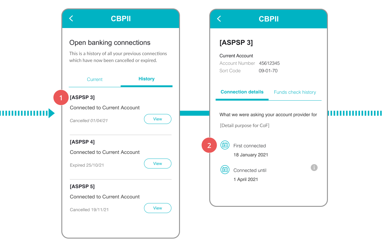 Where the PSU has cancelled the permission, or the consent has expired, the CBPII should provide a list of these previous connections as shown below. If the CBPII does not provide an archive on the Dashboard it must nevertheless be available on request.