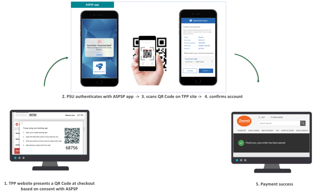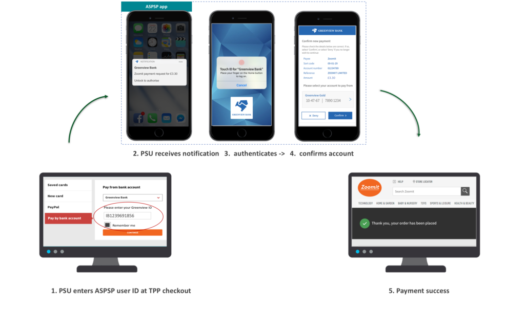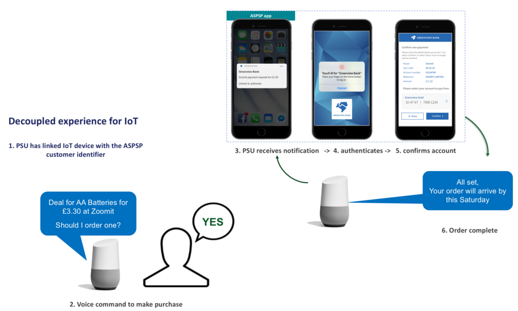 A Decoupled authentication allows a TPP to have the PSU authenticate with their ASPSP app when the PSU is consuming the TPP service on a device other than the one which has the ASPSP app, or even when the PSU is not present on the TPP channel.